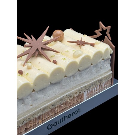 La bûche Luméa s’ouvre sur un sablé spéculos délicatement croquant, aux notes chaleureuses d’épices. Il soutient un moelleux citron ultra fondant, enveloppé d’une mousse cream-cheese citron vert fraîche et légèrement acidulée. Une pointe de menthe vient apporter un éclat aromatique rafraîchissant, avant que la ganache montée au Kalamansi — intense et vive — ne déploie toute la complexité d’un agrume rare. En finition, un gel pep’s au citron vert apporte une touche brillante, acide et vibrante. Une création lumineuse, fraîche et terriblement addictive.
